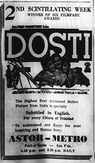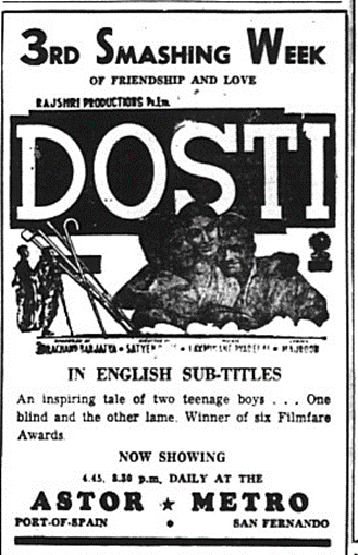 Dosti was also a big hit in Trinidad. It ran for three weeks at the Astor cinema in Port-of-Spain and the Metro cinema in San Fernando where it was first released. The following advertisements appeared in the Trinidad Guardian in the first two weeks of its release in Trinidad.
