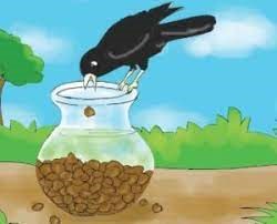 The story conveyed by the poster in my primary school is sometimes called the “The Story of the Thirsty Crow” where the cat is replaced by a crow. The picture on the left shows the crow dropping pebbles into the jug to raise the level of water.